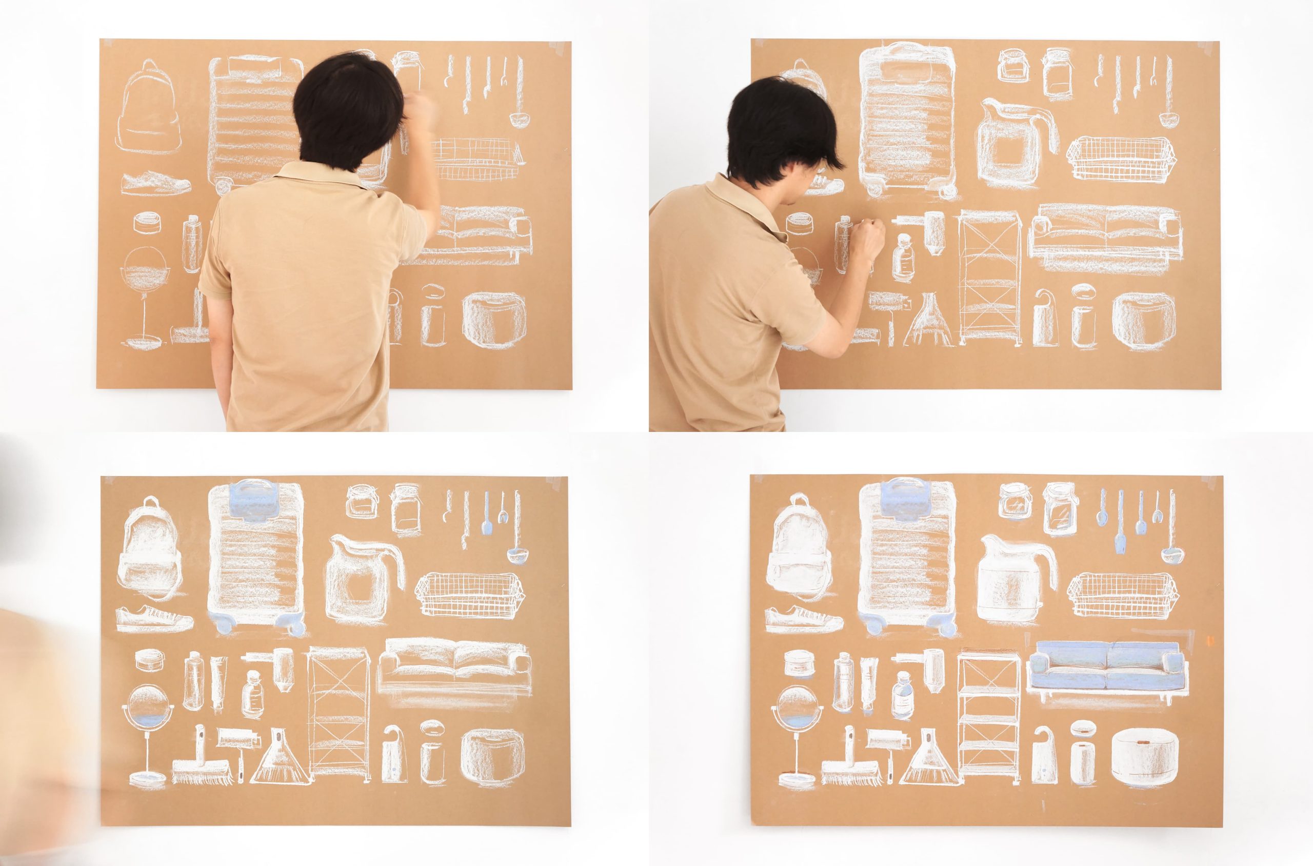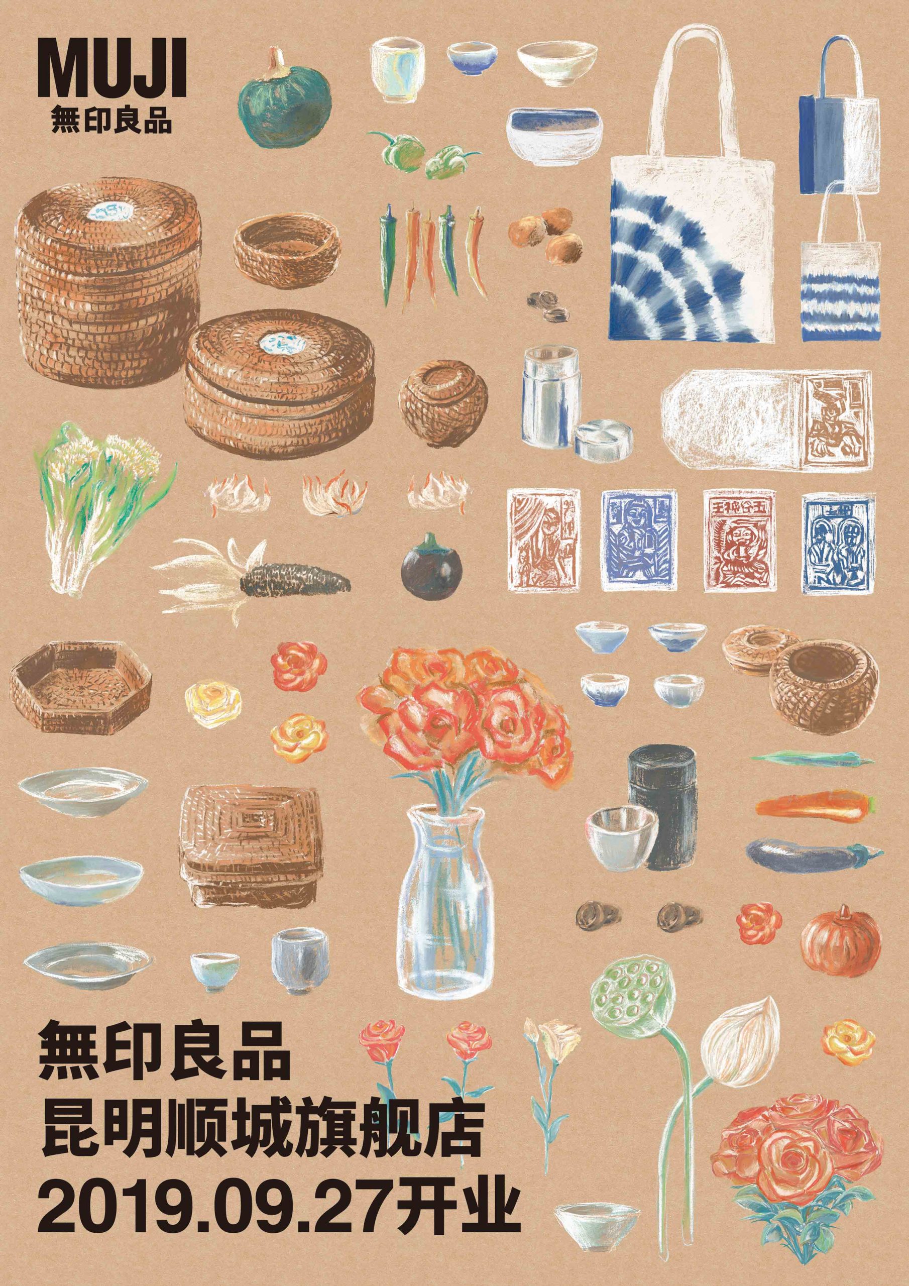 無印良品昆明顺城旗舰店是中国第5家、云南首家大型旗舰店;国内首家有售鲜花、蔬果的市场屋台;以及滇南人文商品等业态。挖掘“在地文化”是MUJI自然生活的理念之一,而昆明因西南多民族共融而居,亦形成了独有的城市在地文化。我们以色粉笔为创作工具,将MUJI标志性产品与云南当地特色风物分别描绘在牛皮纸上,以同一种绘画技法表现两种不同文化孕育而生的产品,以此来传递昆明旗舰店的独特魅力,以及MUJI希望多元文化的共融自然发生在我们的生活中。