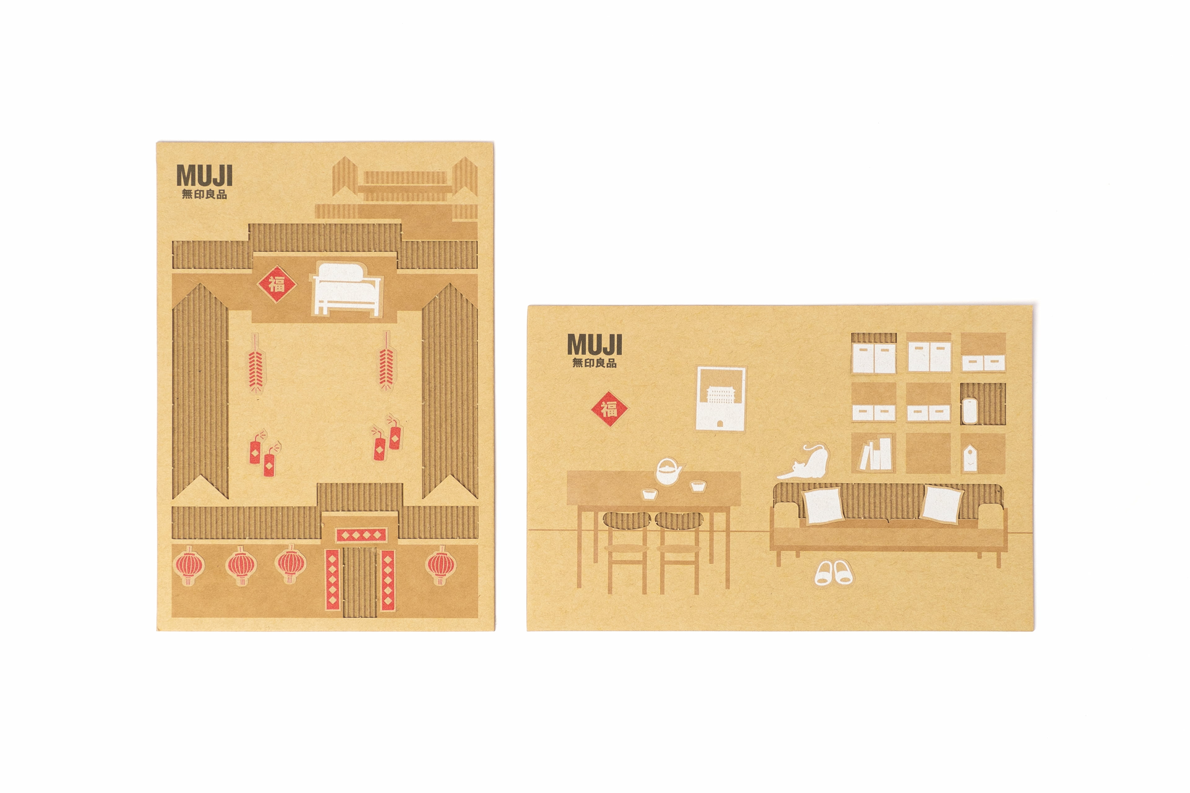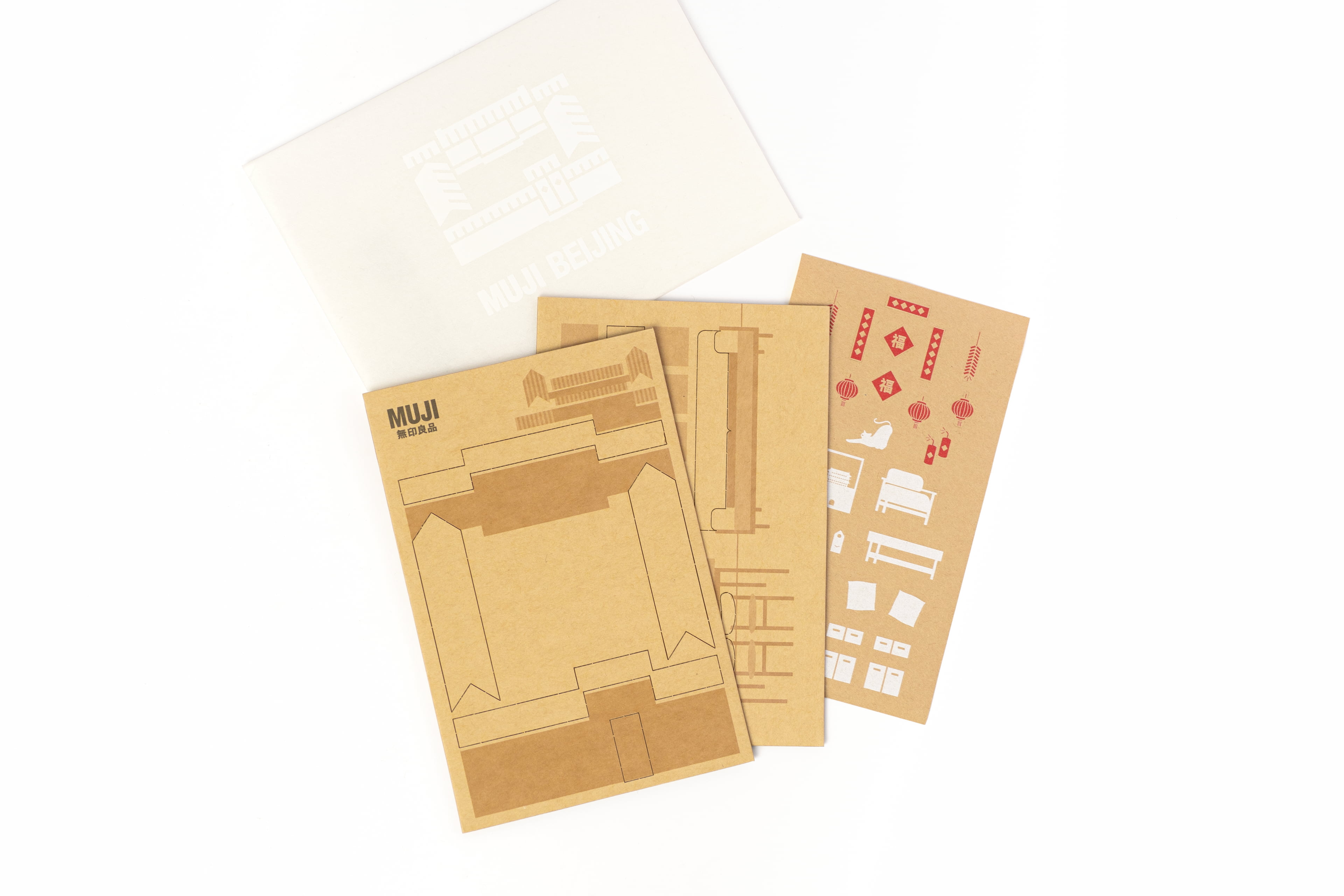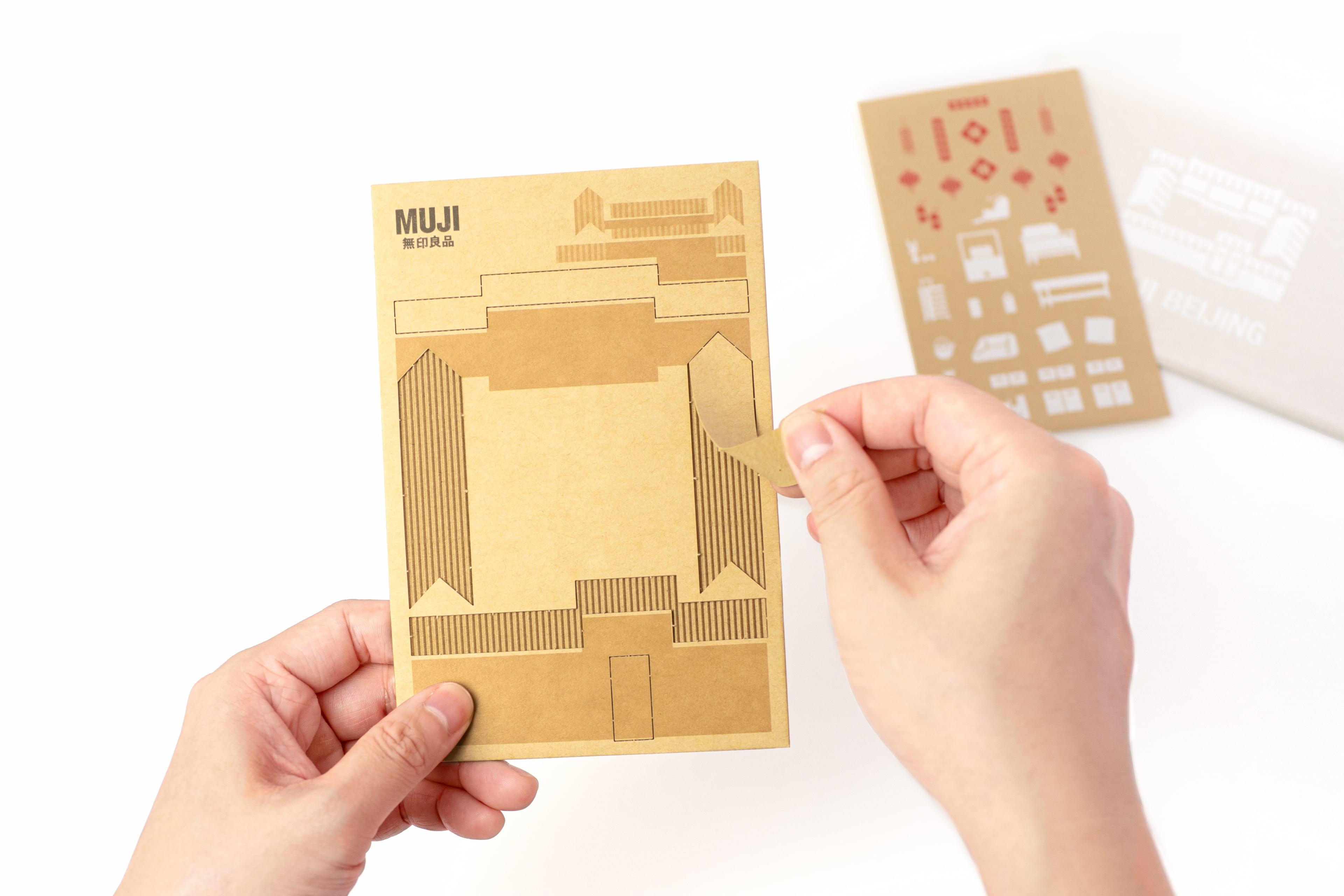 为配合北京旗舰店开业宣传,设计了两款可以“玩起来”的限定礼品。其一礼品以北京地标为原型(四合院,大前门,天坛,华表,长城),建构起简洁的几何积木块,其中四合院积木上印刻MUJI的产品图形,寓意与良品一起搭建生活图景,四合院积木与地标积木可任意组合搭配出属于自己心里的北京一角。其二礼品为DIY瓦楞纸明信片,在揭开明信片上的瓦楞纸后,即展现出完整的明信片画面,贴纸上的物品,可任意搭配粘贴在明信片上,使明信片画面更生动有趣。