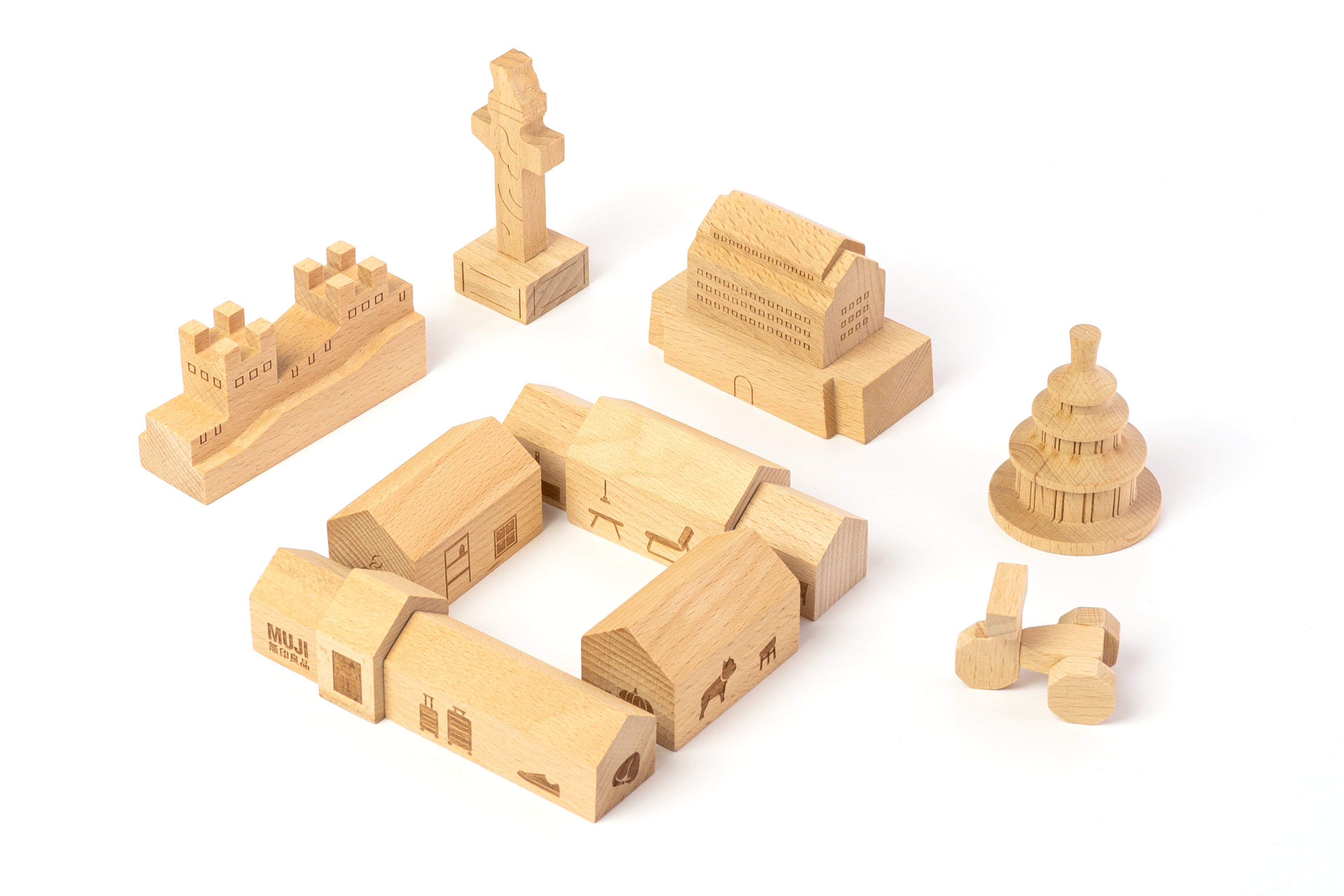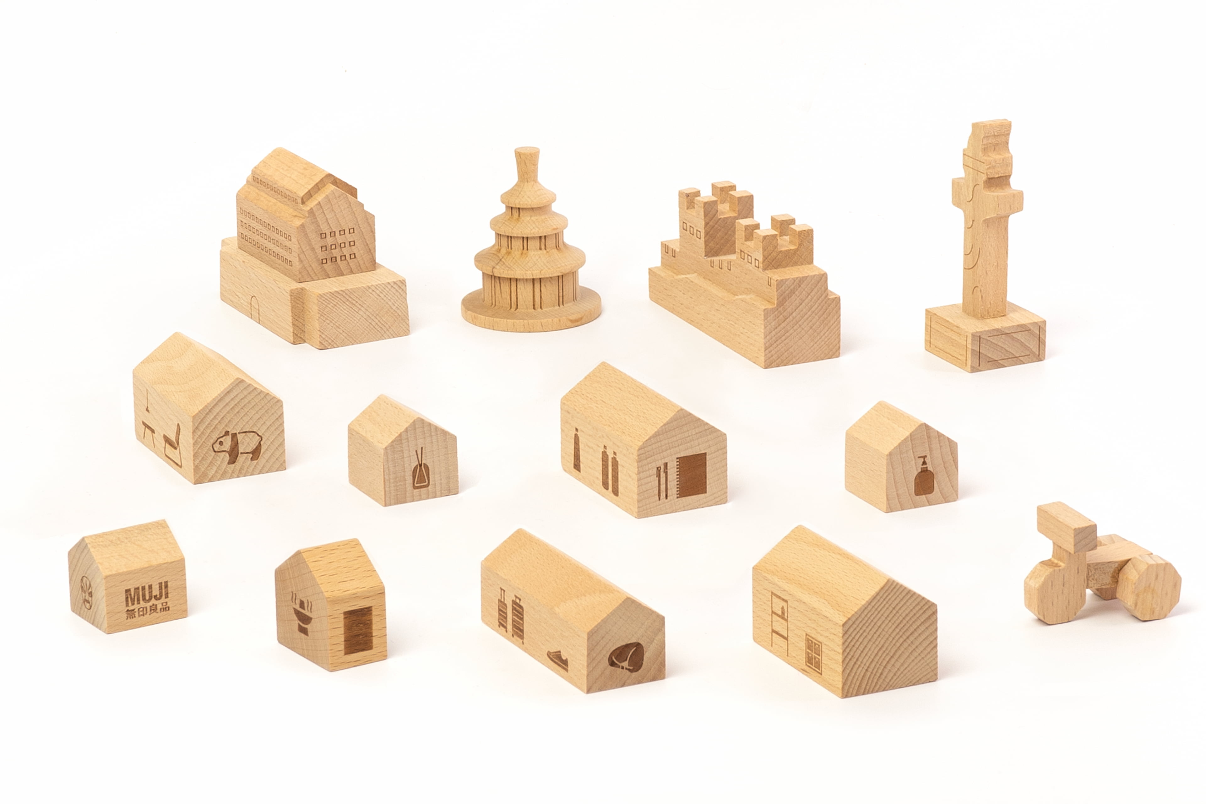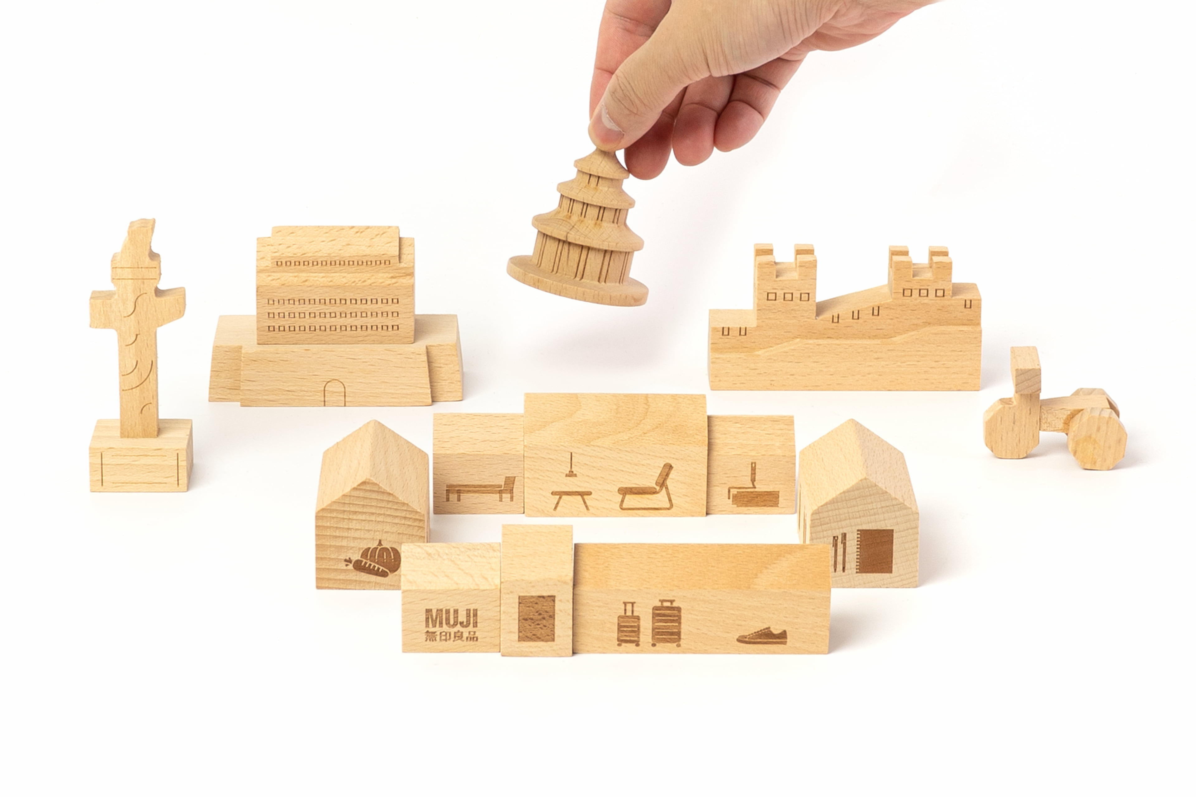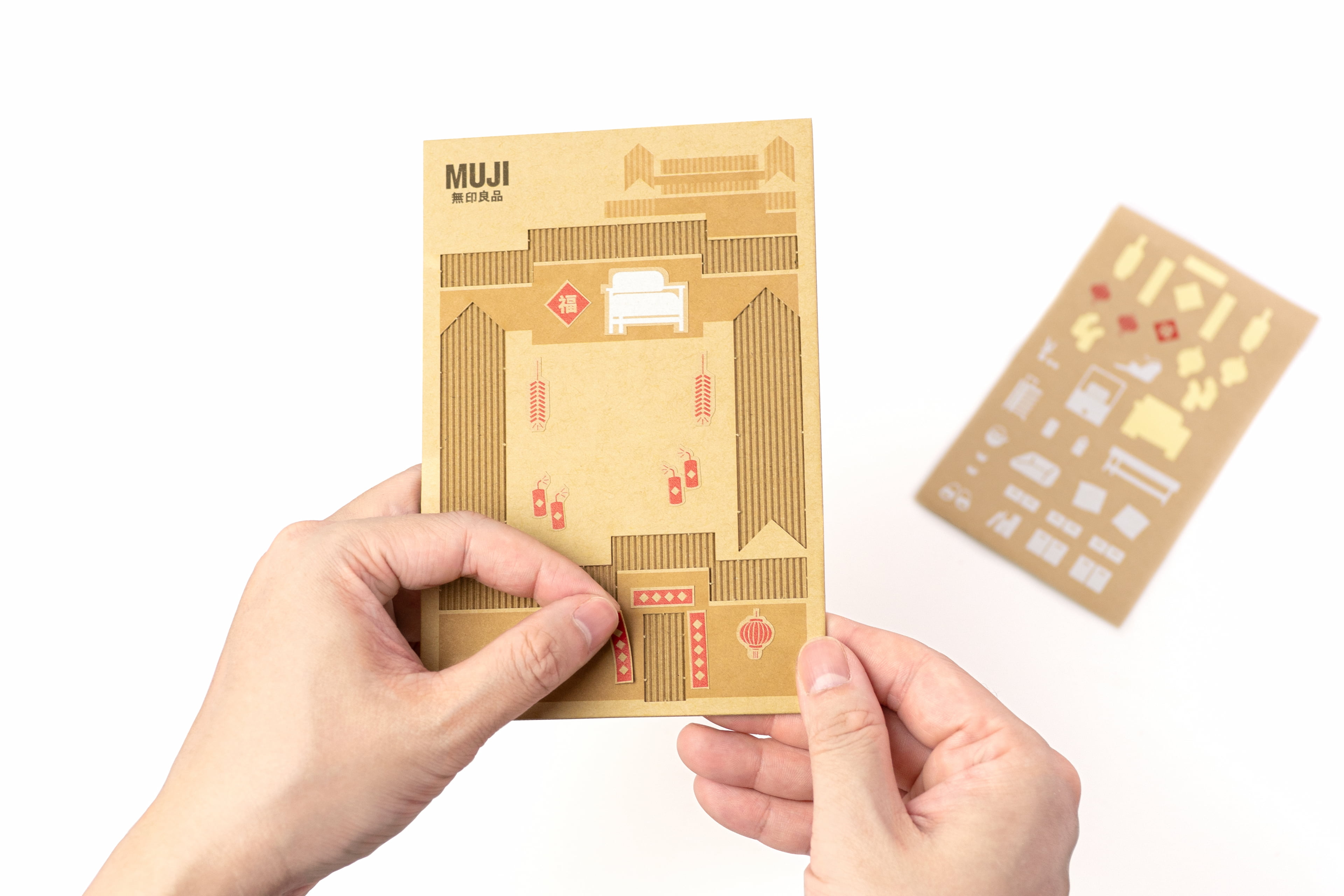 为配合北京旗舰店开业宣传,设计了两款可以“玩起来”的限定礼品。其一礼品以北京地标为原型(四合院,大前门,天坛,华表,长城),建构起简洁的几何积木块,其中四合院积木上印刻MUJI的产品图形,寓意与良品一起搭建生活图景,四合院积木与地标积木可任意组合搭配出属于自己心里的北京一角。其二礼品为DIY瓦楞纸明信片,在揭开明信片上的瓦楞纸后,即展现出完整的明信片画面,贴纸上的物品,可任意搭配粘贴在明信片上,使明信片画面更生动有趣。