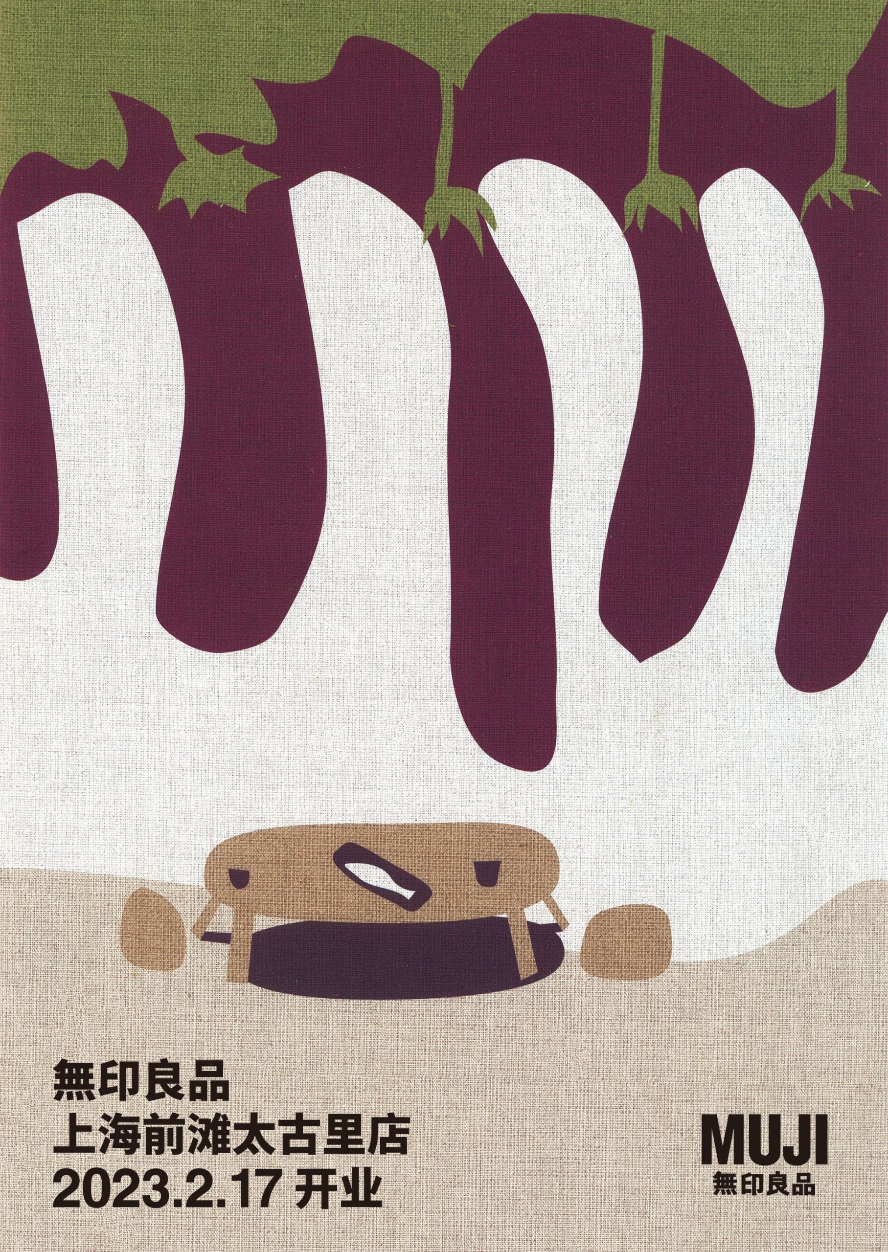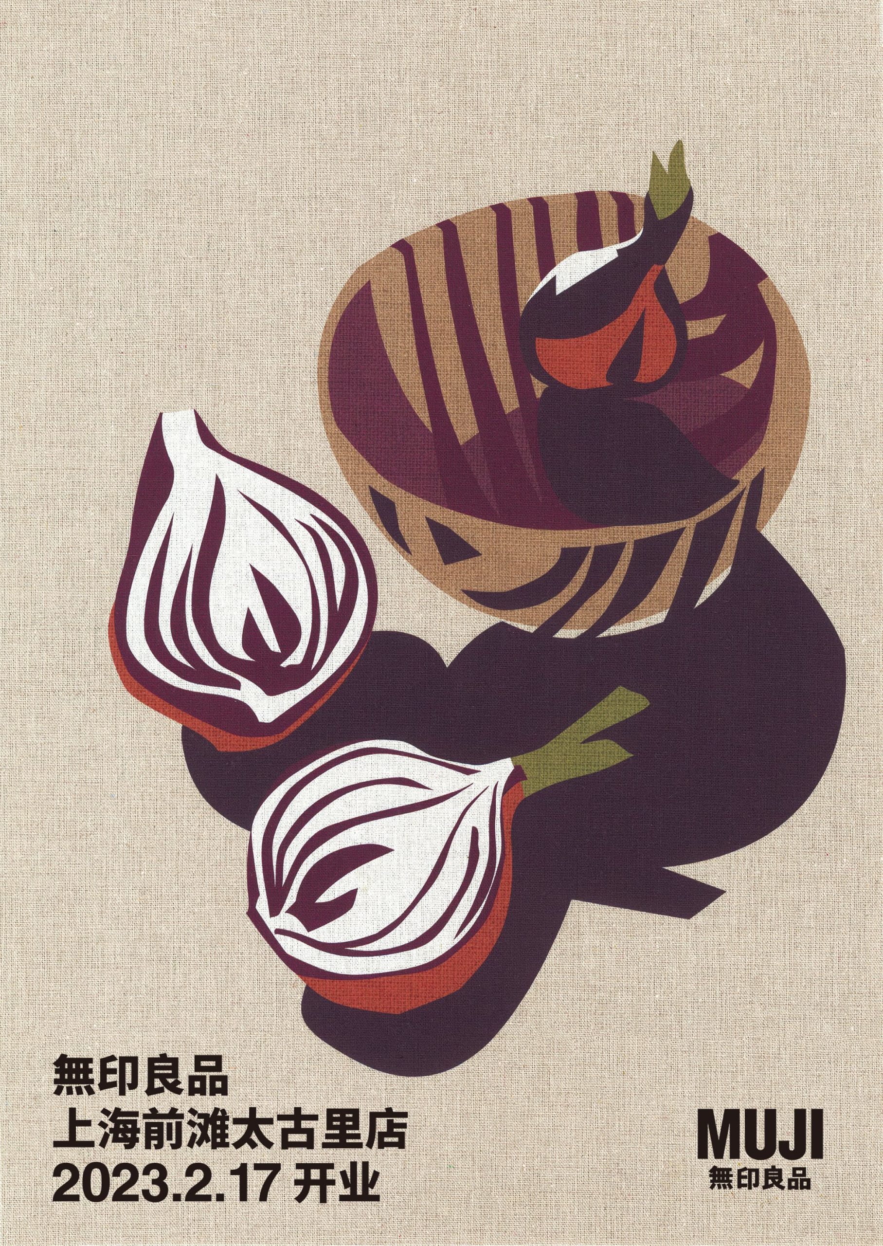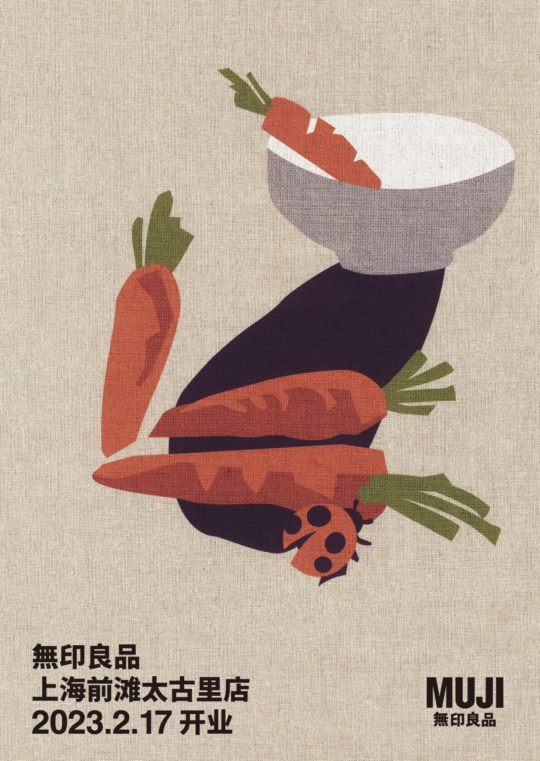 無印良品上海前滩太古里店在国内第一次引入MUJI MARCHE业态(無印良品自营农场),MUJI意在将“农”与“食”的距离拉近,产地的气息在这里如探手可及。由此我们想营造一种这样的生活状态——门前一隅良田,架上总有应季的瓜果,食材总是看得见的最新鲜、最放心的…而在这MUJI街市,这个理想离我们近了一步。所以,我们用简单随性的线条勾勒出新鲜蔬菜,然后将它们印在黄麻布上制作成开业海报;黄麻布在旧时为常用的农产品运输包装材料,其材料自然朴实,给人环保、复古的印象,契合了我们希望赋予画面“找寻回记忆中自然、健康的田园生活”之寓意。