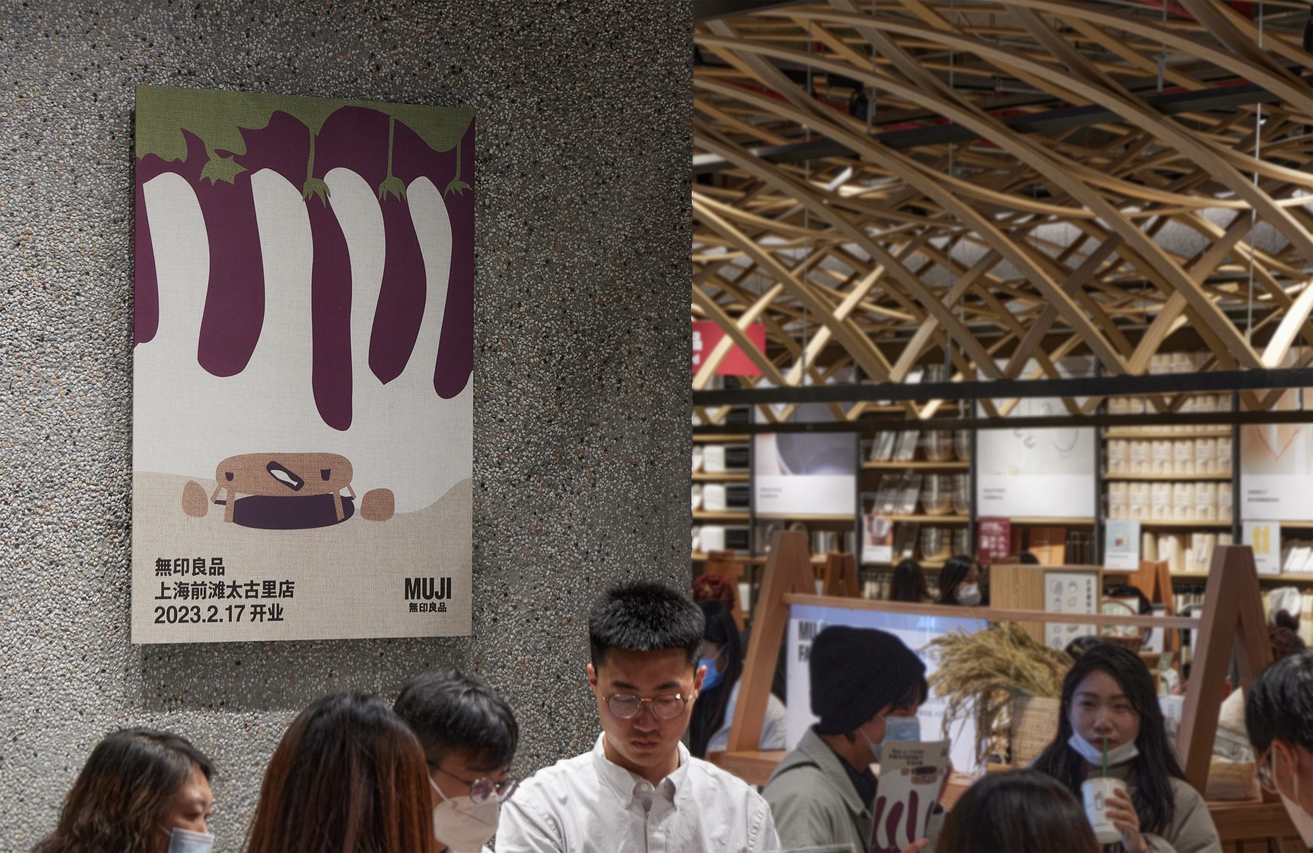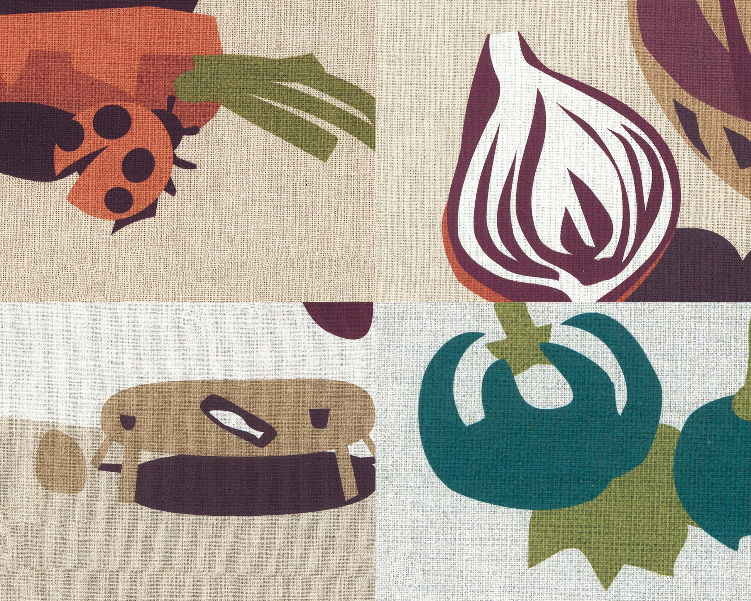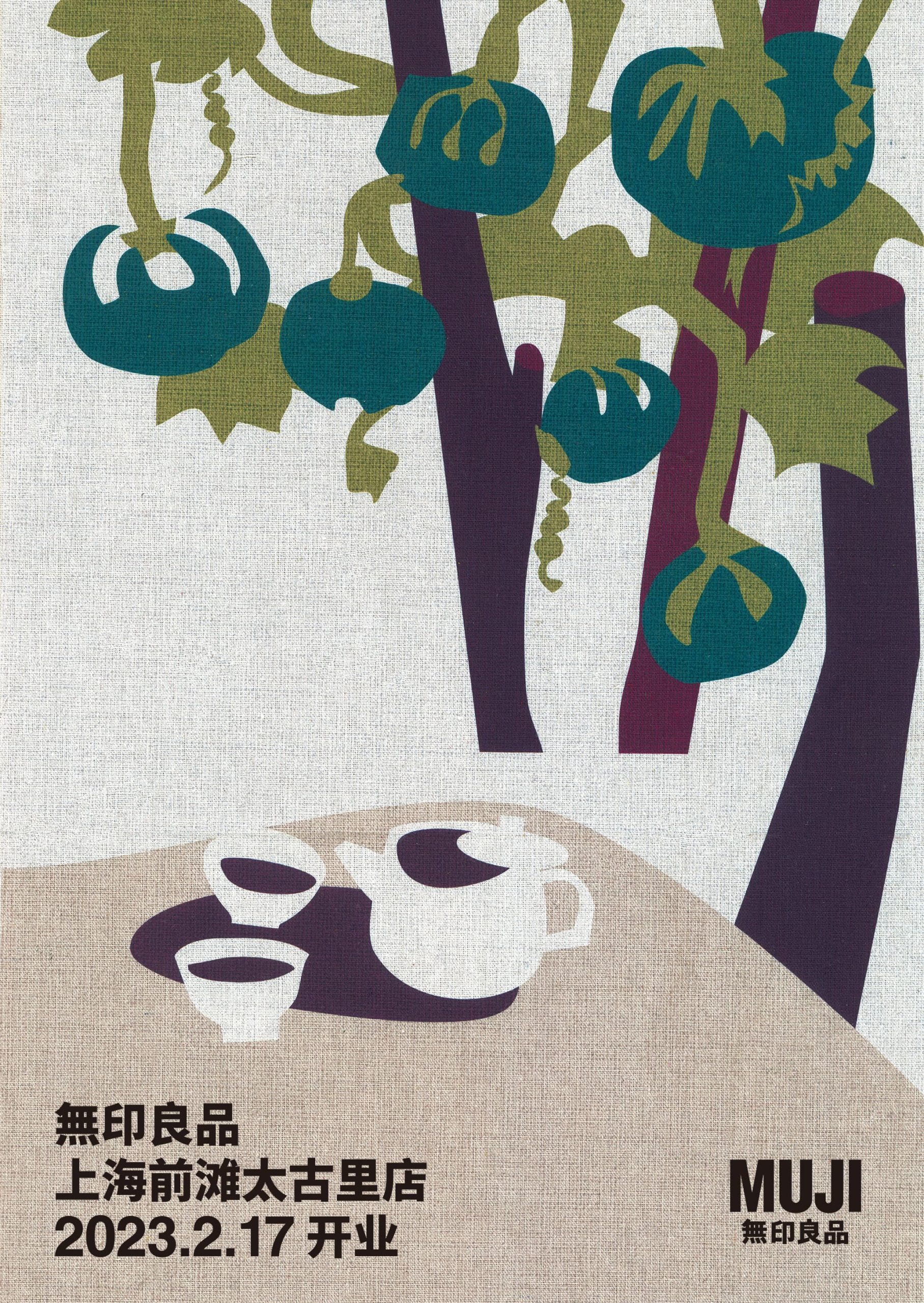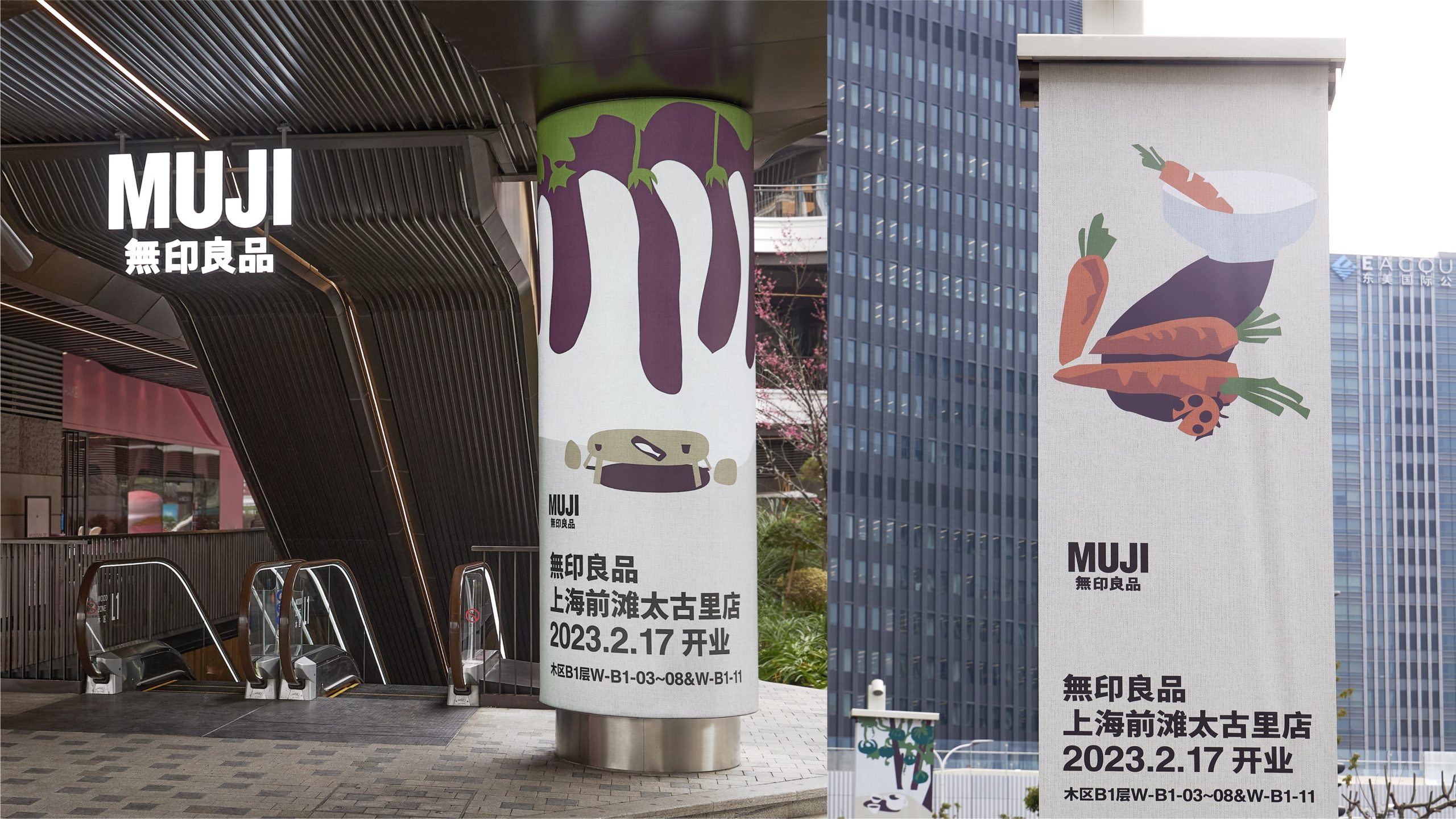 無印良品上海前滩太古里店在国内第一次引入MUJI MARCHE业态(無印良品自营农场),MUJI意在将“农”与“食”的距离拉近,产地的气息在这里如探手可及。由此我们想营造一种这样的生活状态——门前一隅良田,架上总有应季的瓜果,食材总是看得见的最新鲜、最放心的…而在这MUJI街市,这个理想离我们近了一步。所以,我们用简单随性的线条勾勒出新鲜蔬菜,然后将它们印在黄麻布上制作成开业海报;黄麻布在旧时为常用的农产品运输包装材料,其材料自然朴实,给人环保、复古的印象,契合了我们希望赋予画面“找寻回记忆中自然、健康的田园生活”之寓意。