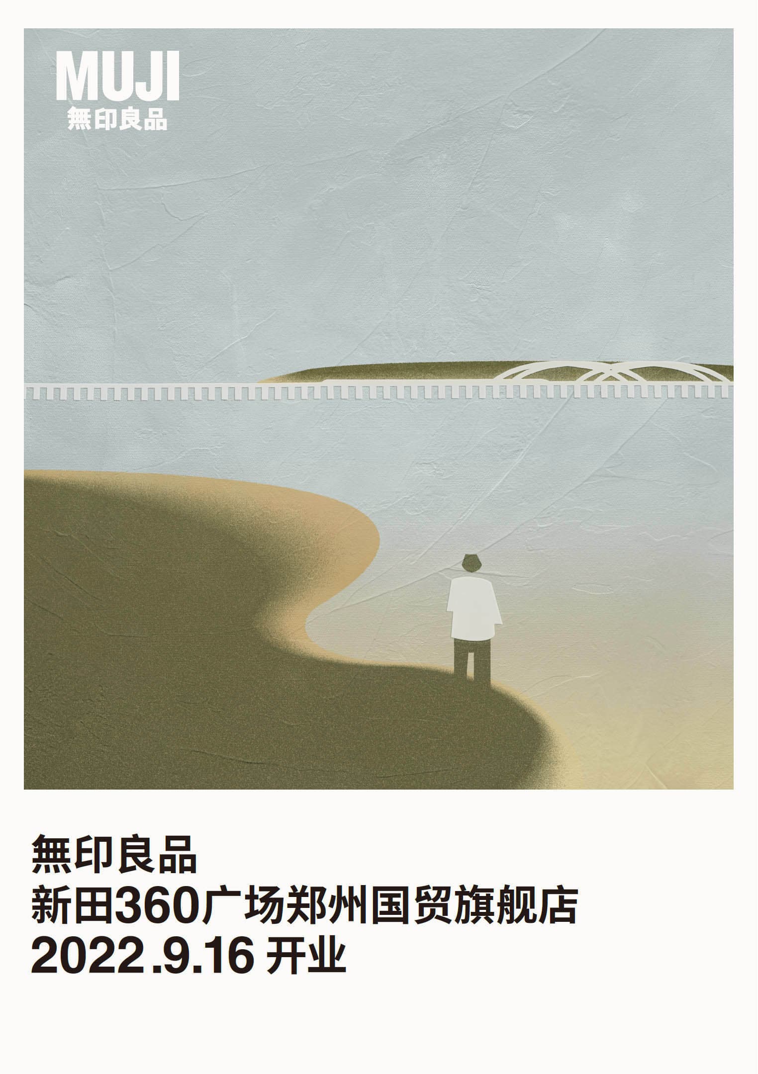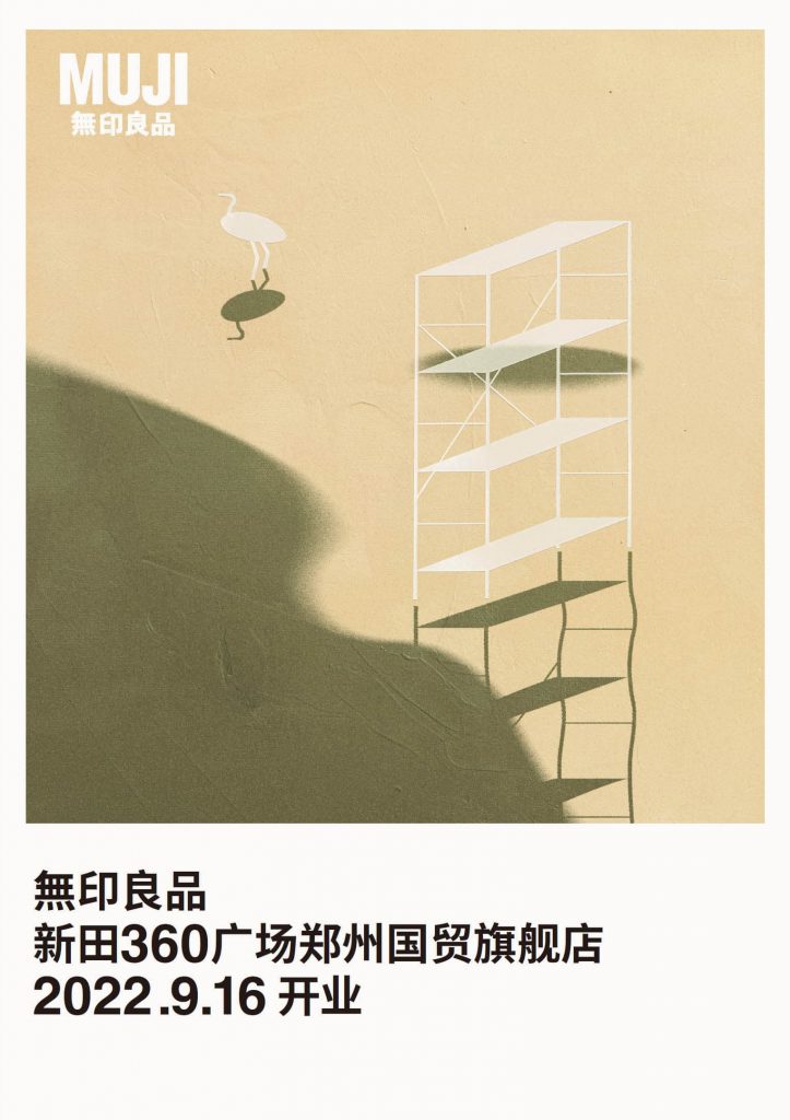 郑州作为国内传统的交通枢纽中心城市,过往的人与发生的故事如黄河一样绵延悠长;MUJI旗舰店的到来,是想真正在这里沉淀下来、成为城市生活美好的一部分,为这里的人们支持着“刚刚好”的日常。MUJI因生活而来,对于“生活应该被温良关照”的期待,值得被回应,海报表现上,我们采用了“河水沉淀”的视觉意象,将MUJI产品以一种温文而质朴的色彩、淡淡地呈现出来,因为MUJI正是用一种“刚刚好”的方式、让生活被关照着…以泥质材料为画布基底,以综合绘画技法(喷枪,剪纸拼贴),勾勒出MUJI在这个城市的沉淀。